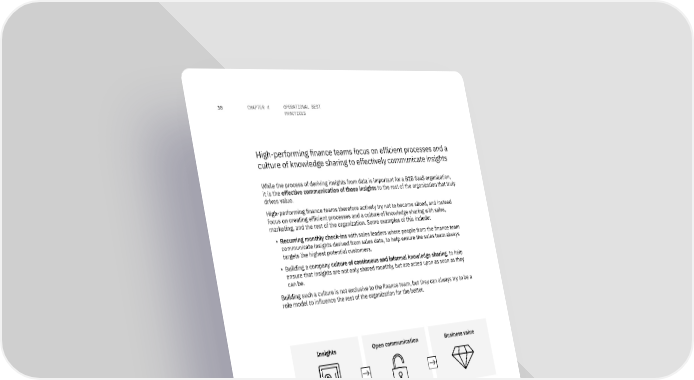 30 CHAPTER 4 OPERATIONAL BEST PRACTICES High-performing finance teams focus on efficient processes and a culture of knowledge sharing to effectively communicate insights While the process of deriving insights from data is important for a B2B SaaS organization, it is the effective communication of those insights to the rest of the organization that truly drives value. High-performing finance teams therefore actively try not to become siloed, and instead focus on creating efficient processes and a culture of knowledge sharing with sales, marketing, and the rest of the organization. Some examples of this include: ▪ Recurring monthly check-ins with sales leaders where people from the finance team communicate insights derived from sales data, to help ensure the sales team always targets the highest potential customers. ▪ Building a company culture of continuous and informal knowledge sharing, to help ensure that insights are not only shared monthly, but are acted upon as soon as they can be. Building such a culture is not exclusive to the finance team, but they can always try to be a role model to influence the rest of the organization for the better. Insights Open communication Business value