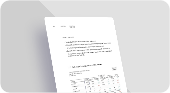 REPORTING 43 CHAPTER 6 TEMPLATES EXAMPLE DISCUSSION ▪ Top 10 client for Q3 '22 contributed 40% of total revenue. ▪ Aligns with new sales strategy to target more SMBs, moving away from large contracts. ▪ US is the strongest performing region, contributing to 60% of revenues. ▪ Supports shift in target customer 2 years ago as company expands presence in US. ▪ Strong revenue growth in Q3 '22 ensure company is on track for FY2022, with 20% of budget left to chase in Q4 '22. 03 SaaS key performance indicators (KPI) overview KEY PERFORMANCE INDICATORS IN SAAS Illustrative Example of KPI reporting example Quarterly KPIs Q3 2022 Actual In $'000s Q3 2022 Q3 2021 YoY Growth Q2 2022 vs. last Qtr Q3 2022B vs. Budget ARR (BOP) 15,000 13,000 15% 14,000 7% 14,500 3% (+) New Business 5,000 4,500 11% 4,500 11% 7,500 (33%) (+) Upsell 1,500 3,000 (50%) 1,000 50% 3,000 (50%) (+) Resurrected - - - - - - - (-) Contraction 250 200 25% 200 25% 300 (17%) (-) Churn 450 900 (50%) 900 (50%) 900 (50%) ARR (EOP) 20,800 19,400 7% 18,400 13% 23,800 (13%) 12 Month Retention rates Gross Revenue Retention 105% 108% 108% 108% Net Revenue Retention 138% 143% 140% 160% Customer / Logo Retention 94% 60% 91% 96% Sales Effectiveness S&M 10,000 12,000 (17%) 11,000 (9%) 12,000 (17%) ACV 73 216 (66%) 74 (1%) 87 (16%) Revenue Per Account 400 380 5% 350 14% 480 (17%) Magic number 5.8 3.8 53% 3.5 66% 4.0 # Customers # of Customers BOP 250 100 150% 225 11% 250 - Customers Churned (15) (40) (63%) (20) (25%) (10) 50% New Customers 50 30 67% 45 11% 35 43% # of Customers EOP 285 90 217% 250 14% 275 4%