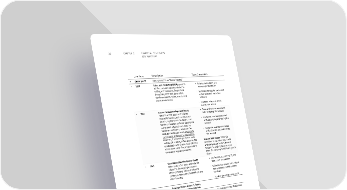 FINANCIAL STATEMENTS 22 CHAPTER 2 AND REPORTING Line item Description Typical examples = Gross profit Also referred to as “Gross income” - S&M Sales and Marketing (S&M) refers to ▪ Salaries to the sales and all the costs and salaries related to marketing organization selling and marketing the product. ▪ Software licenses for tools used Everything from lead generation, within sales and marketing pipeline creation, sales, events, and software brand are included. ▪ Any costs related to brand, events, and similar - R&D Research and Development (R&D) ▪ Costs and salaries associated refers to all the costs and salaries with designing the product related to building and continuously ▪ Costs and salaries associated developing the products. Salary costs with developing and testing the for the company’s software developers product is therefore a typical such cost. As building a software product can be ▪ Costs and salaries associated seen as creating an asset, R&D costs with releasing and maintaining can in some instances be capitalized. the product However, if presenting a metric such as EBITDA or EBIT, or Net Income, the Note on R&D Capex: While it’s capitalized costs should most often be permitted to capitalize R&D it will added back since they are part of the artificially inflate bottom line and company’s regular operations. tends to be slightly frowned upon when the company is still in its growth phase - G&A General and Administrative (G&A) ▪ HR, finance, accounting, IT, and refers to all other costs and salaries legal costs and salaries related to the ongoing operations ▪ Software licenses for tools related of the company. G&A in a software to the operations of the above context is not much different from any functions other industry. ▪ All other general purpose costs = EBITDA Earnings Before Interest, Taxes, Depreciation, and Amortization - D&A Depreciation and Amortization (D&A) ▪ Hardware and other fixed assets refers to the writing down of tangible are depreciated and intangible assets over time. ▪ Capitalized R&D costs are Software is considered a tangible depreciated asset and is therefore depreciated and not amortized. ▪ Patents, trademarks, and other intangible assets are amortized = EBIT Earnings Before Interest and Taxes - Interest Interest expenses refers to the costs ▪ Interest costs on borrowed money related to the borrowing of money. ▪ Capital leases = EBT Earnings Before Taxes - Taxes Taxes refers to the taxes paid on any ▪ Taxes on positive earnings before positive EBT. The tax rate can vary by taxes region and country. = Net income Also referred to as “Net profit”, “Net earnings”, and “bottom line”.