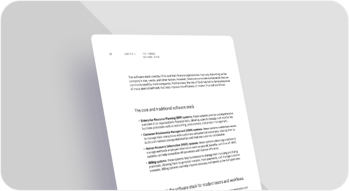 37 CHAPTER 5 THE FINANCE SOFTWARE STACK The software stack used by CFOs and their finance organizations may vary depending on the company's size, needs, and other factors. However, there are some core components that are commonly used by most companies. Furthermore, the rise of SaaS has led to the development of many specialized tools that help improve the efficiency of modern financial workflows. The core and traditional software stack ▪ Enterprise Resource Planning (ERP) systems: these systems provide a comprehensive overview of an organization's financial data, allowing users to manage and monitor key business processes such as accounting, procurement, and project management. ▪ Customer Relationship Management (CRM) systems: these systems enable businesses to manage their interactions with customers and potential customers, helping them to build and maintain strong relationships and improve customer satisfaction. ▪ Human Resource Information (HRIS) systems: these systems allow organizations to manage and track employee information such as payroll, benefits, and time off. HRIS systems can help streamline HR processes and improve efficiency. ▪ Billing systems: these systems help businesses to manage their invoicing and billing processes, allowing them to generate invoices, track payments, and manage customer accounts. Billing systems can help improve accuracy and speed up the billing process. Additions to the software stack for modern teams and workflows ▪ Spend management software tracks and manages non-payroll business expenses such as raw materials, services, and subscriptions. Some tools also offer software-enabled corporate cards for automatic expense management. ▪ Sales compensation software automates the accounting and administration of commissions and incentive plans based on customizable rules such as employee role, tenure, and sale type. ▪ Equity management software facilitates the administration of a company's equity and stock, also known as cap table management. ▪ Corporate performance management (CPM) and Financial planning and analysis (FP & A) software helps large companies monitor and manage the strategies that drive their business activities. It is used to create and implement processes and methodologies for tracking key performance indicators (KPIs). ▪ Analytics platforms or business intelligence (BI) software provide a set of tools for businesses to organize, analyze, and derive actionable insights from data to inform business strategy and improve decision-making. ▪ Data platforms process, transform, and ingest data to facilitate its consolidation and use for better decision-making. These platforms act as a central repository that integrates data from a wide range of internal and external sources.