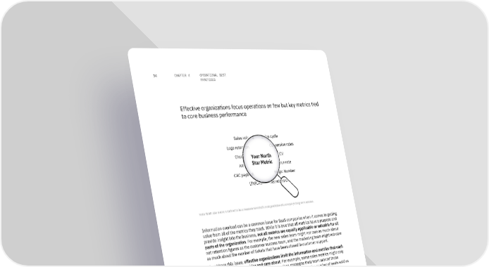 34 CHAPTER 4 OPERATIONAL BEST PRACTICES Effective organizations focus operations on few but key metrics tied to core business performance Sales volume Sales cycle Logo retention Conversion rates Churn Your North ACV ARR Star Metric Run rate CAC payback Magic Number LTV/CAC Net retention Note: North star metric is defined to be a measurement that's most predictive of a company's long-term success. Information overload can be a common issue for SaaS companies when it comes to getting value from all of the metrics they track. While it is true that all metrics have a purpose and provide insight into the business, not all metrics are equally applicable or valuable for all parts of the organization. For example, the new sales team might not care as much about net retention figures as the customer success team, and the marketing team might not care as much about the number of tickets that have been closed in customer support. To address this issue, effective organizations limit the information and metrics that each individual needs to consider and care about. For example, some sales metrics might only need to be shared with sales leaders who can then strategize their team around those metrics. And for individual salespeople, only needing to focus on the number of seats sold as their guiding metric can help them stay focused on achieving that specific goal. Guiding an organization with only a few important metrics also makes performance much more easily comparable. This allows organizations to track how the sales team is performing on an individual basis, over time, and when targeting different customer groups or regions. "Focusing on too many metrics can be a distraction. It's therefore important to select a few key metrics that closely relate to the business's performance, so that everyone stays aligned with the company's goals. In our sales team, we found that tracking the number of seats sold was the most important metric for keeping us on track." Therefore, keeping it simple and choosing the right metric to guide the organization can be key to success. The best metric to use will vary from company to company, but it should be something that is closely tied to the core business performance. For sales teams, this could be something related to the volume of sales, such as the number of seats sold or the amount of revenue generated. For customer support teams, it could be something related to the number of tickets closed or customer satisfaction.