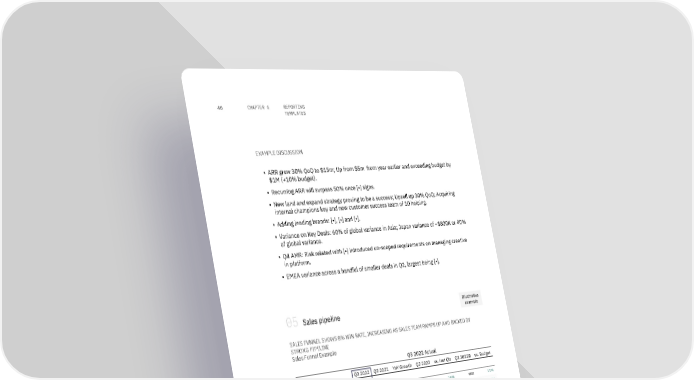 REPORTING 46 CHAPTER 6 TEMPLATES EXAMPLE DISCUSSION ▪ ARR grew 30% QoQ to $15m; Up from $5m from year earlier and exceeding budget by $1M (+10% budget). ▪ Recurring ARR will surpass 50% once [•] signs. ▪ New land and expand strategy proving to be a success; Upsell up 30% QoQ; Acquiring internal champions key and new customer success team of 10 helping. ▪ Adding leading brands: [•], [•] and [•]. ▪ Variance on Key Deals: 60% of global variance in Asia; Japan variance of ~$800K or 40% of global variance. ▪ Q4 AMR: Risk related with [•] introduced un-scoped requirements on managing creative in platform. ▪ EMEA variance across a handful of smaller deals in Q2, largest being [•]. Illustrative 05 Sales pipeline example SALES FUNNEL SHOWS 8% WIN RATE, INCREASING AS SALES TEAM RAMPS UP AND BACKED BY STRONG PIPELINE Sales Funnel Example Q3 2022 Actual In $'000s Q3 2022 Q3 2021 YoY Growth Q2 2022 vs. last Qtr Q3 2022B vs. Budget Sales funnel Prospects 1,000 200 400% 800 25% 900 11% MQL 800 150 433% 600 33% 700 14% SQL 520 100 420% 400 30% 500 4% Closed deals 78 10 680% 50 56% 80 -3% Win rate 8% 5% 3% 6% 2% 9% -1% Sales pipeline ACV Setup Probability Pipeline Sources Account Name (USD) fee (%) Close Date Status Region [Customer Name] Company Inc. 42,000 5,000 90% 31/12/2022 Carryover AMR Program 2022- AMR Partnerships (NL, Company 2 Inc. 47,220 3,370 90% 03/10/2022 Commit EMEA DE, FR & UK) (all products) 2022 BigBucks Ltd. 103,000 0 90% 04/10/2022 Commit EMEA SaaS EMEA 2022 Affiliates Firm 1 GmbH 42,667 1,300 90% 31/10/2022 Carryover EMEA Global