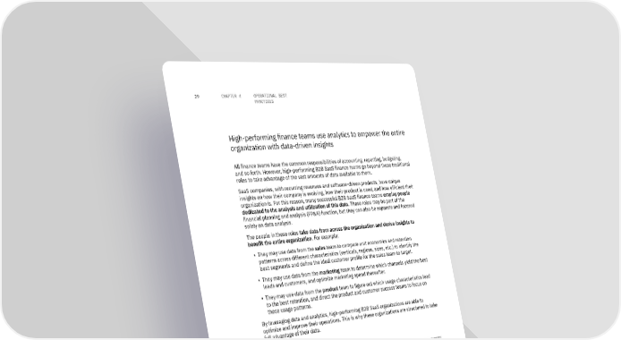 29 CHAPTER 4 OPERATIONAL BEST PRACTICES High-performing finance teams use analytics to empower the entire organization with data-driven insights All finance teams have the common responsibilities of accounting, reporting, budgeting, and so forth. However, high-performing B2B SaaS finance teams go beyond these traditional roles to take advantage of the vast amounts of data available to them. SaaS companies, with recurring revenues and software-driven products, have unique insights on how their company is evolving, how their product is used, and how efficient their organization is. For this reason, many successful B2B SaaS finance teams employ people dedicated to the analysis and utilization of this data. These roles may be part of the financial planning and analysis (FP&A) function, but they can also be separate and focused solely on data analysis. The people in these roles take data from across the organization and derive insights to benefit the entire organization. For example: ▪ They may use data from the sales team to compare unit economics and retention patterns across different characteristics (verticals, regions, sizes, etc.) to identify the best segments and define the ideal customer profile for the sales team to target. ▪ They may use data from the marketing team to determine which channels yield the best leads and customers, and optimize marketing spend thereafter. ▪ They may use data from the product team to figure out which usage characteristics lead to the best retention, and direct the product and customer success teams to focus on these usage patterns. By leveraging data and analytics, high-performing B2B SaaS organizations are able to optimize and improve their operations. This is why these organizations are structured to take full advantage of their data. FOR THE MODERN-DAY CFO, DATA IS THE NAME OF THE GAME - ANALYSING CROSS COMPANY INPUTS TO OBTAIN DATA-DRIVEN OUTPUTS Other departments Product Sales Finance Marketing Data Analytics Other departments