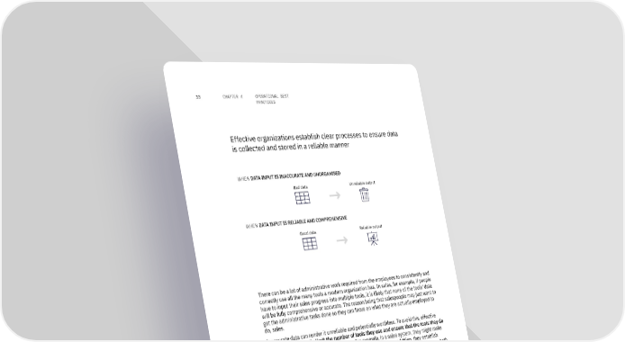 33 CHAPTER 4 OPERATIONAL BEST PRACTICES Effective organizations establish clear processes to ensure data is collected and stored in a reliable manner WHEN DATA INPUT IS INACCURATE AND UNORGANISED Bad data Unreliable output WHEN DATA INPUT IS RELIABLE AND COMPREHENSIVE Good data Reliable output There can be a lot of administrative work required from the employees to consistently and correctly use all the many tools a modern organization has. In sales, for example, if people have to input their sales progress into multiple tools, it is likely that none of the tools' data will be fully comprehensive or accurate. The reason being that salespeople may just want to get the administrative tasks done so they can focus on what they are actually employed to do, sales. Inaccurate data can render it unreliable and potentially worthless. To avoid this, effective organizations typically limit the number of tools they use and ensure that the tools they do use can be used efficiently and correctly. For example, in a sales system, they might make certain fields "required" and validate the data types of inputs. In addition, they establish clear processes and provide education on these processes to ensure that all employees, both new and experienced, know how to use the systems correctly. "The value of data lies in its reliability and comprehensiveness. A key hire for us was therefore a dedicated sales operations person that ensures that our systems are used correctly and consistently." However, administrative tasks are never easy to get right consistently. In these cases, many high-performing organizations hire a specific sales or revenue operations person who is responsible for ensuring that the systems are used correctly and that the data can be relied upon. For some organizations, this key hire can make the difference between data being worthless and data becoming a key driver of the organization's success.