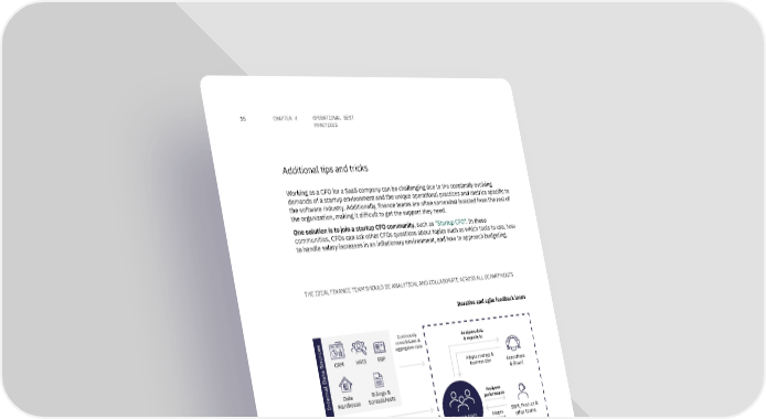 35 CHAPTER 4 OPERATIONAL BEST PRACTICES Additional tips and tricks Working as a CFO for a SaaS company can be challenging due to the constantly evolving demands of a startup environment and the unique operational practices and metrics specific to the software industry. Additionally, finance teams are often somewhat isolated from the rest of the organization, making it difficult to get the support they need. One solution is to join a startup CFO community, such as "Startup CFO". In these communities, CFOs can ask other CFOs questions about topics such as which tools to use, how to handle salary increases in an inflationary environment, and how to approach budgeting. THE IDEAL FINANCE TEAM SHOULD BE ANALYTICAL AND COLLABORATE ACROSS ALL DEPARTMENTS Iterative and agile feedback loops es Continously Analyses data c consolidates & & reports to aggregates data CRM HRIS ERP Adapts strategy & business plan Executives & Board ernal Data SourData Billings & Int Warehouse Spreadsheets Analyses performance Finance team Adapts S&M, Product & es (led by CFO) function/ other teams c department strategy Bank Suppliers Public Checks compliance ernal Data Sour Auditors, Regulators Reports to & Market Ext Partners Customers