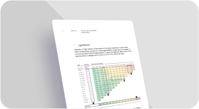 METRICS AND PERFORMANCE 7 CHAPTER 1 MEASUREMENTS 01 Logo Retention Customer, or "logo," retention is the measure of how many customers in a cohort remain after a certain period. Logo retention can be represented as a single figure. For example, if a company says they "have 67% logo retention," it means they have been able to retain 67% of their customers on average every 12 month, or 67% x 67% = 45% in two years. Cohort Cohort size Share of customers remaining #of customers Sign-up month added Month 0 Month 1 Month 2 Month 3 Month 4 Month 5 Month 6 Month 7 Month 8 Month 9 Month 10 Month 11 Month 12 Month 13 2021 July 178 100% 97% 93% 90% 87% 84% 82% 80% 78% 75% 73% 71% 60% 58% 2021 August 180 100% 97% 97% 93% 91% 89% 87% 84% 84% 82% 80% 78% 69% 67% 2021 September 149 100% 100% 97% 95% 92% 92% 89% 89% 87% 84% 81% 79% 68% 68% 2021 October 191 100% 98% 96% 96% 94% 92% 90% 87% 85% 83% 81% 79% 69% 2021 November 200 100% 98% 96% 94% 92% 90% 90% 90% 88% 88% 86% 86% D 2021 December 210 100% 98% 96% 94% 92% 90% 89% 87% 87% 87% 87% 2022 January 208 100% 100% 98% 98% 98% 98% 96% 96% 94% 92% 2022 February 179 100% 98% 98% 98% 98% 97% 96% 94% 94% C 2022 March 176 100% 100% 100% 100% 100% 100% 99% 98% 2022 April 227 100% 100% 99% 98% 97% 96% 96% 2022 May 193 100% 100% 100% 99% 99% 99% 2022 June 233 100% 99% 99% 99% 99% 2022 July 202 100% 100% 99% 98% 2022 August 243 100% 99% 99% B 2022 September 213 100% 100% 2022 October 215 100% A E Weighted average 100% 99% 98% 96% 95% 93% 91% 90% 87% 85% 82% 79% 67% 64% The weighted average logo retention rate is in relation to the number of customers added from each cohort. While the aggregate retention figure can be used to compare the company against others, it doesn't tell the full story, and that is not the reason why retention metrics are used. Instead, analyzing the developments of individual cohorts is what reveals how the company is performing. For example, looking at the table above, we can see that: A. The number of customers added each month is increasing, indicating the company is getting better at acquiring new customers. B. A larger share of customers remains from more recent cohorts than from older ones, indicating the company is either acquiring more sticky customers or they are getting better at customer success. C. There is a significant increase in the share of customers remaining between the December 2021 and January 2022 cohorts, indicating the company likely started identifying more sticky customer segments to target for new sales.
