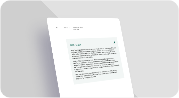 32 CHAPTER 4 OPERATIONAL BEST PRACTICES CASE STUDY Excel is perhaps the most classic example of such software. Since it is well-known and understood by most people, employees can start using it immediately and deliver value to the organization. The files created in Excel can be easily shared with anyone in the organization or the broader industry, and everyone will be able to access its contents and insights. While insights in Excel can be more efficiently presented using a business intelligence or analytics platform, this requires continuous maintenance and integration with the organization's various tools and databases. If the organization has the capabilities and expertise to do this, the end results can be great. However, if it is done as a one-off effort or using an external consultant, it is at risk of falling apart. Thus, high-performing finance teams limit the number of tools they use and choose tried-and-tested tools that they know will be used, maintained, and supported for many years to come.