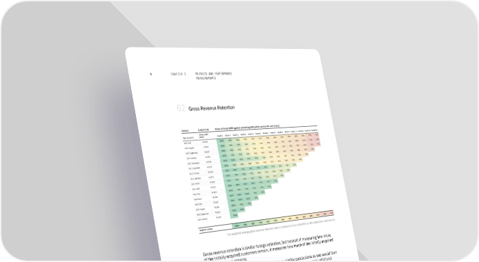 9 CHAPTER 1 METRICS AND PERFORMANCE MEASUREMENTS 02 Gross Revenue Retention Cohort Cohort size Share of initial MRR against remaining MRR (after contraction and churn) Initial $ MRR Sign-up month added Month 0 Month 1 Month 2 Month 3 Month 4 Month 5 Month 6 Month 7 Month 8 Month 9 Month 10 Month 11 Month 12 Month 13 2021 July 54,701 100% 98% 96% 93% 91% 91% 89% 89% 89% 87% 85% 85% 77% 75% 2021 August 44,136 100% 97% 97% 95% 94% 92% 90% 88% 86% 85% 83% 83% 74% 72% 2021 September 55,887 100% 98% 96% 94% 92% 92% 92% 90% 87% 85% 84% 83% 76% 75% 2021 October 46,883 100% 98% 97% 95% 93% 91% 90% 88% 88% 86% 85% 85% 78% 2021 November 49,531 100% 100% 98% 97% 97% 95% 93% 92% 92% 90% 88% 87% 2021 December 63,112 100% 98% 96% 95% 94% 92% 92% 91% 90% 90% 90% 2022 January 63,888 100% 100% 99% 99% 99% 99% 97% 96% 95% 95% 2022 February 63,112 100% 99% 99% 97% 96% 95% 95% 95% 95% 2022 March 64,986 100% 99% 98% 98% 98% 96% 95% 95% 2022 April 56,902 100% 100% 100% 100% 99% 99% 99% 2022 May 57,113 100% 99% 99% 99% 99% 99% 2022 June 57,561 100% 100% 100% 99% 99% 2022 July 72,004 100% 100% 100% 99% 2022 August 75,163 100% 99% 99% 2022 September 75,864 100% 100% 2022 October 75,693 100% Weighted average 100% 99% 98% 97% 96% 95% 94% 92% 91% 89% 86% 84% 76% 74% The weighted average gross revenue retention rate is in relation to the initial MRR or ARR added from each cohort. Gross revenue retention is similar to logo retention, but instead of measuring how many of the initially acquired customers remain, it measures how much of the initially acquired recurring revenue remains. By analyzing gross revenue retention, you can draw similar conclusions as you would from analyzing logo retention. However, if you compare the two figures, you gain additional insights about the company. If gross revenue retention is higher than logo retention, the company is better at retaining its larger, more revenue-generating customers. If gross revenue retention is lower than logo retention, it suggests the opposite. In the example, where the one-year average gross revenue retention is 76% and the logo retention is 67%, we can immediately see that the company is better at retaining its higher paying customers. WHAT GREAT LOOKS LIKE ▪ >90% gross revenue retention for enterprise clients, >80% gross revenue retention for SMB clients ▪ Retention is consistent across the cohort and not driven by a few power-users